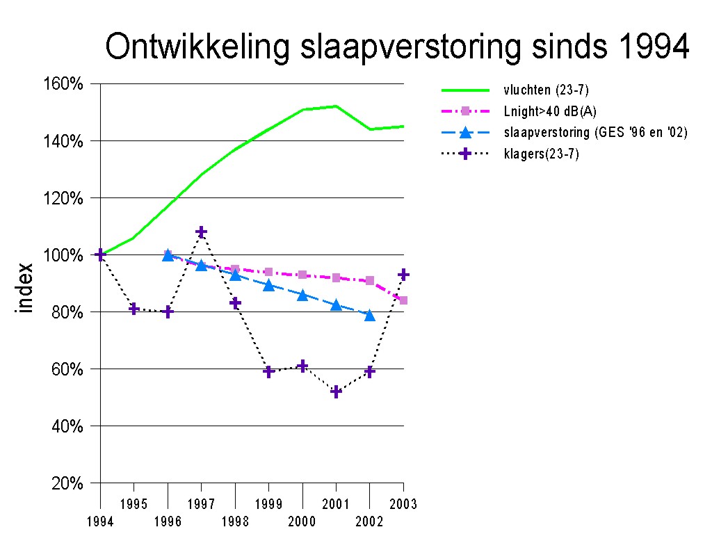 In deze grafiek wordt het verloop van het aantal geregistreerde nachtelijke klachten rond Schiphol weergegeven tussen 1994 en 2003. Daarnaast tevens de groei in het vliegverkeer (groen) en het aantal blootgestelden binnen de 40 dB-nacht contour. De piek in klachten rond 1996 is waarschijnlijk het gevolg geweest van de tijdelijke sluiting van de Kaagbaan. Over de periode 1994-2002 lijken de klachten gestaag af te nemen, tot zich weer een scherpe piek aandient: de opening van de polderbaan wellicht?